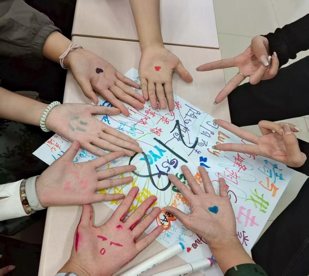 为破解这一难题,公司开展了一场名为 “请与我击掌” 的心理活动。活动现场,绘满多彩文字与图案的纸张铺展在桌面上,那是大家对老员工活的期许与感悟。参与者们伸出手掌,有的画着俏皮的笑脸,有的绘着温暖的爱心,还有的用色彩勾勒出独特的符号,然后与同伴们轻轻击掌。