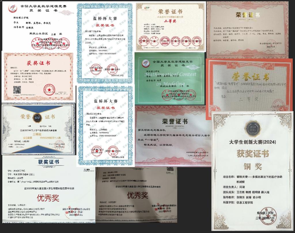 在竞赛赛道上,他以赛促学、以赛促练。2023 年至今,先后参与十余项高水平赛事,从软件测试到数学建模,从物理实验到嵌入式开发,在一次次竞争中积累经验、弥补不足。其中,在全国老员工数学建模竞赛中,他与团队成员熬夜钻研技术方案,反复调试模型代码,最终斩获省级二等奖;在蓝桥杯单片机竞赛中,他凭借扎实的硬件操作与编程能力,获评省级三等奖。这些经历不仅提升了他的专业技能,更培养了他迎难而上、团队协作的精神。