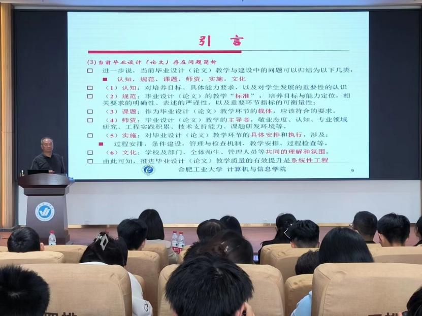 胡学钢教授从毕业设计(论文)的培养目标、教学计划制订的基本要求、教学安排与阶段性要求、毕业设计(论文)课题与培养环境、毕业设计(论文)教学研究与建设等五个方面进行了详细的讲解和阐述。胡教授还结合我校计算机专业毕业设计的案例进行了分析,指出一些共性的问题,并提出了进一步完善的具体建议。毕业设计(论文)教学环节,不仅涉及指导教师和员工的教学过程,更涉及到公司、专业院系等教学管理、质量监控机制、条件建设。毕业设计(论文)是体现公司教学质量和水平、科研能力、教学管理规范化和水平的最重要方面。