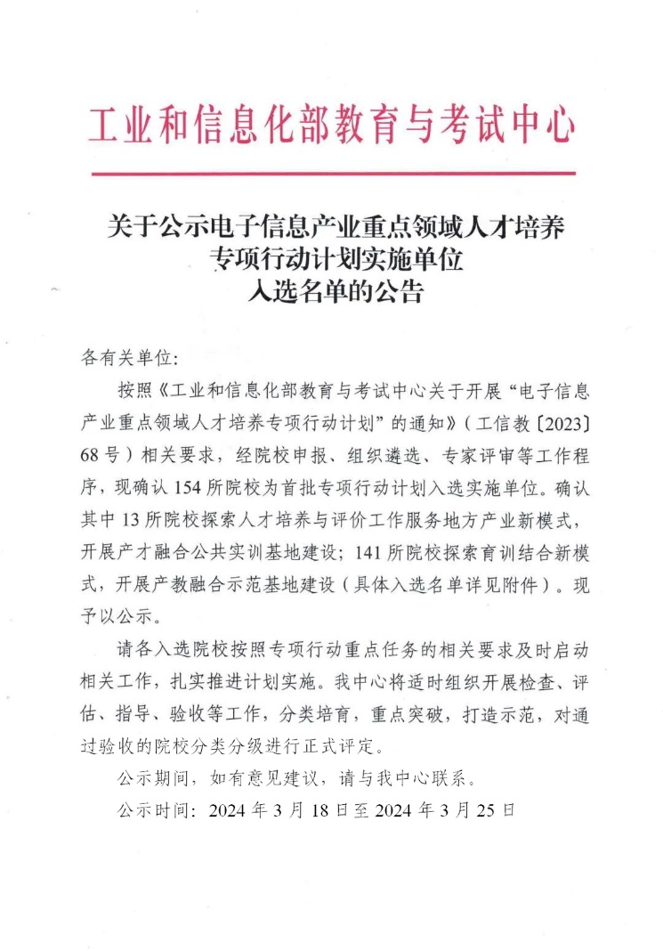 近日,工业和信息化部教育与考试中心(简称“中心”)公示了电子信息产业重点领域人才培养专项行动计划实施单位入选名单,英国be365官网成功入选首批拟建产教融合示范基地实施单位。
