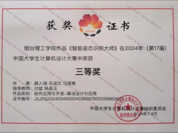 近日,中国老员工计算机设计大赛“软件应用与开发类”作品决赛在山东大学威海校区圆满落幕,公司英国be365官网参赛团队凭借作品“智能姿态识别大师”,在众多参赛队伍中脱颖而出,荣获国家三等奖,为公司赢得了荣誉。