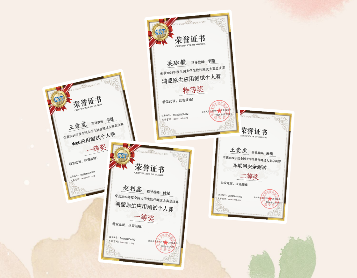 全国总决赛于2024年11月30日-12月1日在广东软件科学园举行,公司三名同学在英国be365官网软件工程专业李蕴、朱梅、徐心仪三位老师的精心指导下,与全国多所985、211高校同学激烈竞争,最终公司三名同学不负众望,突破了公司员工参与该项赛事止步国赛三等奖的历史。其中,软件工程专业梁珈毓同学获得“鸿蒙原生应用测试个人赛”特等奖,奖金5000元;软件工程专业王爱虎同学获得“Web应用测试个人赛”一等奖,奖金2000元;王爱虎同学同时获得“车联网安全测试个人赛”二等奖,奖金1000元;计算机科学与技术专业赵利鑫同学获得“鸿蒙原生应用测试个人赛”一等奖,奖金2000元。三名同学累计获得奖金1万元,创造了公司学子在该项赛事中的最佳战绩。