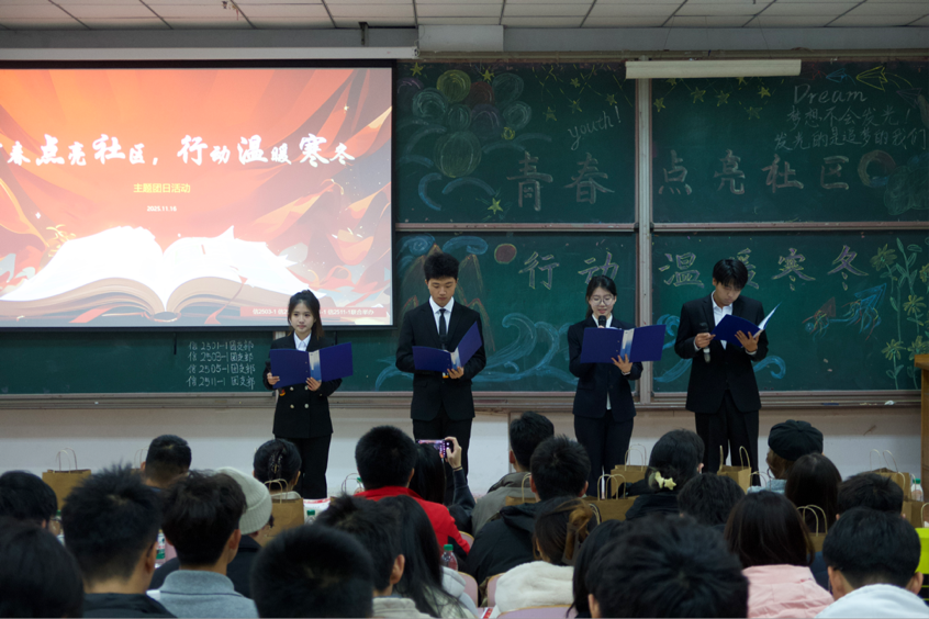 为凝聚青年奋进力量,践行志愿服务精神,以青春热忱展现学子担当,11月16日晚,25级各团支部于二教115开展“青春点亮社区,行动温暖寒冬”主题团日活动。公司辅导员韩懿婧、于东,25级新生班主任及全体同学共同齐聚一堂,共同见证这场青春与温暖交织的团日活动。